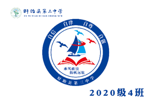 班旗主体的外围是以蓝色为底色的圆形,蓝色代表着宁静祥和,积极向上的班集体,有着较强的班级凝聚力。上方是班训:自信、自律、自尊、自强。下方写着盱眙县第三中学。班旗的内部,上部分是由形似“4”字样的帆船在书籍铺成的海洋上遨游。帆船借助红色的风力向前行驶,红色的风力象征着革命与抗争的精神,寓意着同学们渴望改变命运的勇气。海鸥的身姿全部向上,向远方飞去,象征着4班全体同学永不言败,积极向上的姿态。班旗内部的下方是以红色为底色的书籍,红色代表热情,志向远大,意指4班的同学们将在知识的海洋里徜徉,快乐成长。
