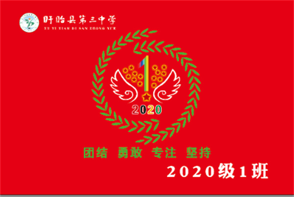 班旗主底色采用中国红,与国旗是一个颜色,寓意爱国,也寓意热情、奔放与斗志。两条绿色的柳条包裹成一个不规则的圆形,绿色象征着青春洋溢,象征着希望,圆寓意着初二(1)班是一个和谐的大家庭。圆中间的数字1,是由多种色彩组成,象征初二(1)班每位同学都有自己的个性和特点。数字1的周围有15颗金黄色的五角星包围,象征着1班必将胜利,必将有所收获。一双展开的翅膀捧着中间的1字,象征着初二(1)班的同学们都很勇敢,都能在自己的天空自由的翱翔。最下方的四个词语:团结、勇敢、专注、坚持,既是对上方图案寓意的一个文字概括,也是班主任对同学们的美好祝愿与期望!