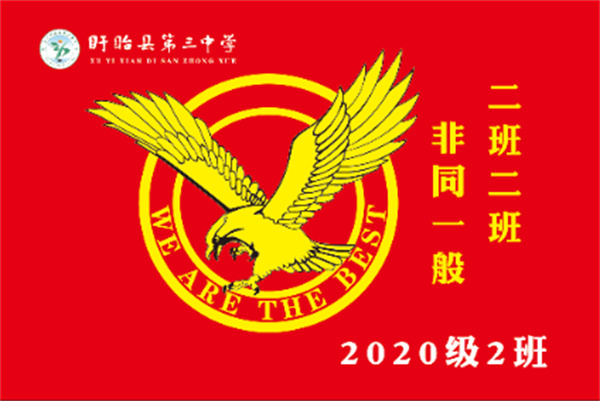 雄鹰,鸟中王者,常翱翔于九天之上,英姿勃发。雄鹰展翅,搏击长空,所释放出的雄浑锐利的力量,却是要经历一个艰辛无比的磨练和近乎脱胎换骨的蜕变重生。班旗以雄鹰展翅为图案,象征着2班同学拥有雄鹰的品格和精神,即一种百折不挠、坚韧不拔、无所畏惧、永不言弃、向上向前的伟大超越拼搏精神。“如果信念有颜色,那一定是中国红”。班旗主色调采用中国红,与党旗国旗同色,象征着热情、奔放,寓意2班同学永远爱党爱国,“请党放心,有我强国,强国有我”。两个皇色圆环,簇拥着皇色雄鹰,象征着火热青春与雄心壮志,寓意着初二(2)班是一个和谐团结拼搏的大家庭。圆环中间的英文“WE ARE THE BEST”,寓意着初二(2)班的同学们都是最棒的。右侧的两句话:二班二班,非同一般。既是对班旗图案寓意的一个高度概括,更是对同学们的美好企盼!
