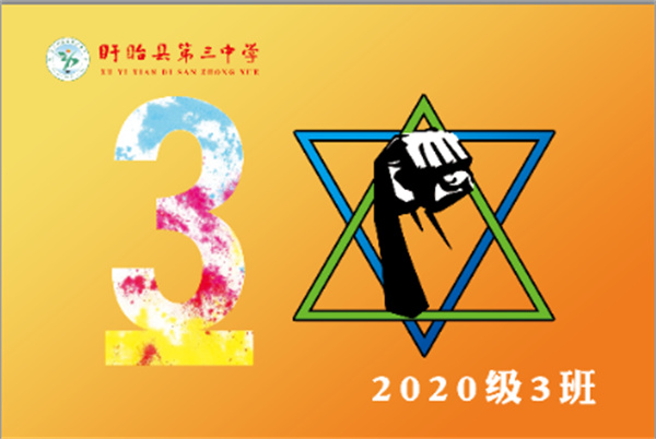 班旗的底色配以渐变的中黄色为主,寓意这是一个温暖阳光的集体,班旗的主体内容分两部分,左边是班级的阿拉伯数字“3”同时配以天蓝,亮黄和粉色,希望这是一个活泼而又丰富多彩的班级。右边是班级的精神图腾,两个组合的几何形中,一个充满力量的拳头打了出来,说明初二(3班)是一个作风硬派的集体,是一个服从指挥,能打胜仗,有钢铁般意志的集体。