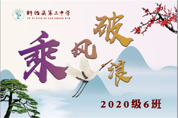 仙鹤,在古代是仅次于凤凰的“一品鸟”,寓意第一。仙鹤振翅向上,代表着6班的同学们向着同级第一的目标奋进!“乘风破浪”指一句古诗:长风破浪会有时,直挂云帆济沧海。意为尽管前路障碍重重,但仍将会有一天乘长风破万里浪,挂上云帆,横渡沧海,到达理想的彼岸(向着同级第一的目标前进),体现6班的同学们不怕吃苦,不怕艰辛,勇往直前的向上精神!山水画的背景,给人们一种静逸的舒适感和高雅的情调,意寓着6班的同学们能够创造一个安静舒适的学习环境,并且争做讲文明、讲礼貌的新时代接班人。