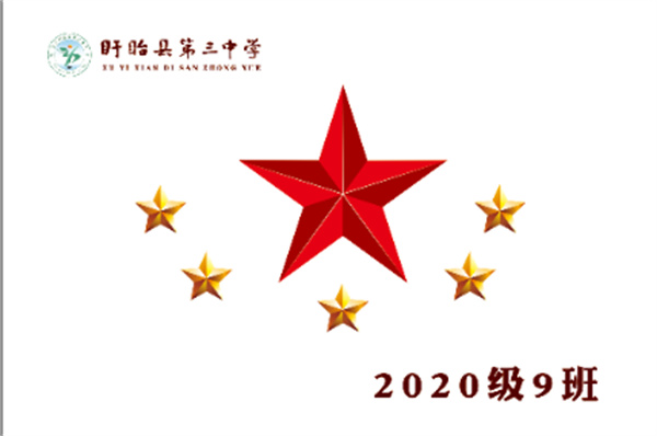 初二(9)班班旗由校徽、学校名称、五角星和班级名称构成。五角星由一个大五角星和五个小五角星构成,象征着我们的孩子是党的孩子,永远跟着党走,团结在党的周围。闪闪发光的小五角星象征着孩子们朝气蓬勃,充满活力,勇往直前。