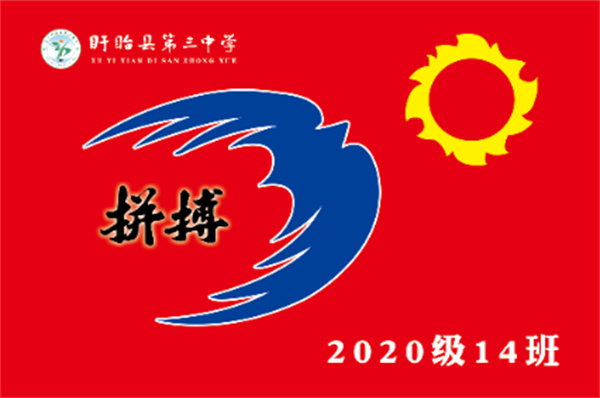 班旗主体是一副雄鹰振翅高飞、追逐红日的形象。雄鹰代指十四班全体同学,太阳代指光明、进步、国家。寓意十四班的同学像雄鹰一样,正积极向上,展翅飞翔;追求进步,精忠报国。鹰两翅之间的“拼搏”,既是点题,唯有拼搏才能翱翔九天,强国有我;也是班级精神的说明。背景是大红,寓意热情、热烈、奔放、向上,与班旗的整体寓意有机统一。