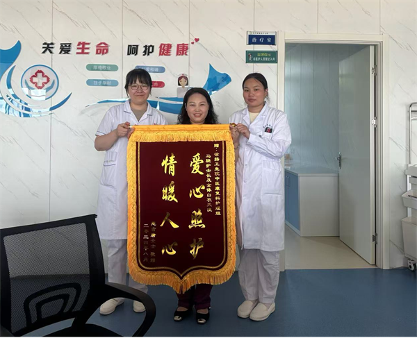 唐女士是一名刚刚来淮工作的异地人员,由于长时间的劳累致腰痛剧烈,不能独立行走,在附近医院治疗多日无明显效果,仍是疼痛剧烈,寸步难行,后经同事介绍至徐杨卫生院中医康复科求诊。科室李主任详细询问病史并查体,结合患者的腰椎CT片诊断为“腰椎间盘突出症伴椎管狭窄”,给出治疗方案,建议患者住院予针灸通经活络止痛,中频局部电刺激促进炎症因子吸收,中医正骨调整脊柱小关节紊乱,中药补肝肾强腰膝等综合治疗。患者因异地医保且无人照料心存顾虑,李主任帮助其办理了线上异地就医手续,并嘱咐护理人员细心照料其日常生活。在中医康复科全体医务人员的精心照护下,唐女士很快康复出院了。为了表达感谢,唐女士给医疗和护理人员赠送了锦旗。