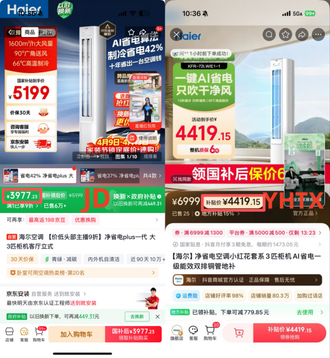 海尔空调小红花套系3匹柜机产品比价也是如此,在【与辉同行】直播间领国补后售卖价格仍然高达4419.15元,同样的款式在JD却能低至3977.23元,差价高达441.92元。这再一次证明,头部主播即便能拿到再高的优惠,但其价格仍不是最真实的低价,仍然有一定的低价空间,而抬高这部分价格空间的恰恰是头部主播直播间的高佣金。