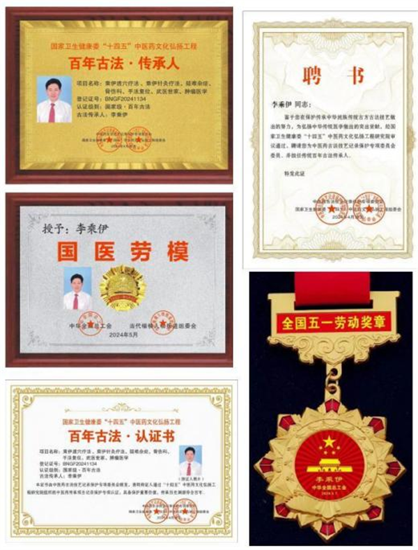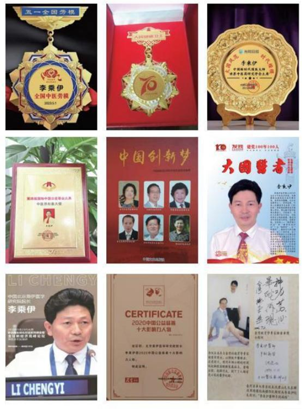 在荣誉面前,李乘伊不敢有半点松懈,他时常牢记恩师吕炳奎送给自己的话悬壶济世、医道无涯”,并以此来勉励 自己。他一路走来,风雨兼程,厚积薄发从“ 中医一技之长 特色疗法"、“优秀名中医特色疗法”,到“ 中国科技创新最 佳发明成果奖”“亚洲医学科技荣耀奖”“中国管理科学研究 与应用优秀成果奖”再到2015 全国中医药十佳最具推广价 值的特色创新疗法,一种疗法获得众多殊荣,不仅彰显其优 越的治病疗效,更突出创立者的精湛医术。